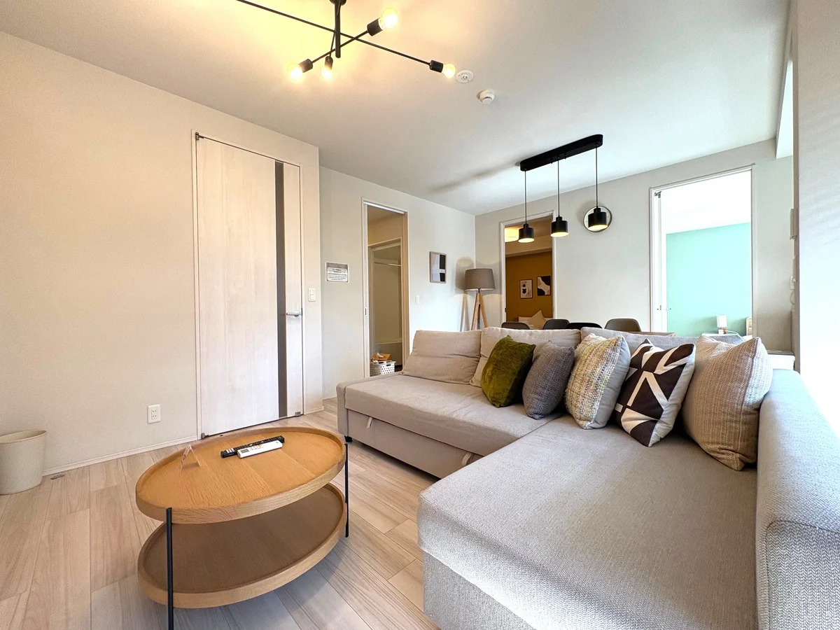機能的なフルキッチンや広々としたソファ、清潔感あふれる水回りを完備し、長期滞在でも自宅のように心地よく、かつ非日常的な高揚感を楽しめる贅沢な2LDKの間取りです。